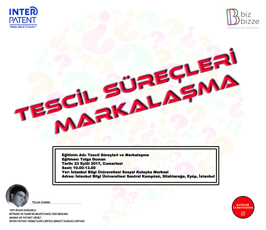 23 Eylül Cumartesi günü 10.00-13.00 saatleri arasında İstanbul Bilgi Üniversitesi Sosyal Kuluçka Merkezi’nde Inter Patent’ten Marka ve Patent Vekili Tolga Duman, “Tescil Süreçleri ve Markalaşma Eğitimi” verecektir.