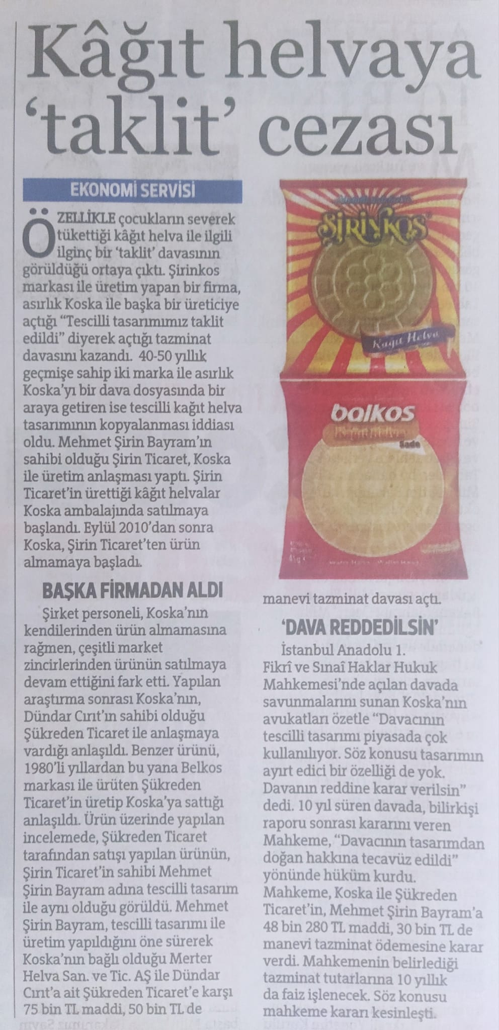 Yapılan araştırmalar sonucu, Koska’nın bir tasarım hakkı ihlali içinde bulunduğu ortaya çıkar ve konu mahkemeye taşınır. Haberin bize anlattığı kadarıyla dava 10 yıl sonunda Şirinkos lehine tamamlanır ve Koska ile birlikte halen Şirinkos’a ait tasarımları taşıyan ürünleri Koska’ya tedarik eden firma tazminata mahkum olur.