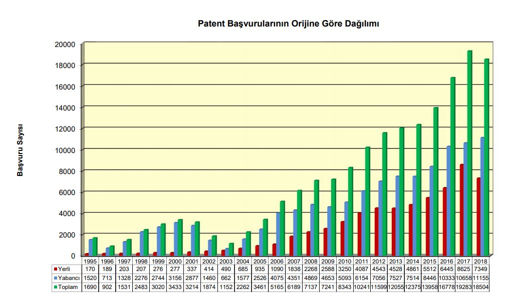 Aşağıda yer alan tabloda Türk Patent Kurumu’nun oluşturulup göreve başladığı 1995 yılından itibaren Türkiye’de yapılan başvuruların dağılımını görebilirsiniz.